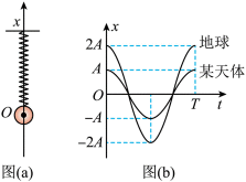 如图(a),将一弹簧振子竖直悬挂,以小球的平衡位置为坐标原点O,竖直向上为正方向建立x轴。若将小球从弹簧原长处由静止释放,其在地球与某球状天体表面做简谐运动的图像如(b)所示(不考虑自转影响),设地球、该天体的平均密度分别为