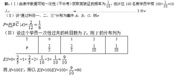 (Ⅲ)该驾校为调动教官的工作积极性,规定若所教学员每通过一个科目的考试,则学校奖励教官100元.现从这20人中随机抽取1人,记X为学校因为该学员而奖励教官的金额数,求X的数学期望.