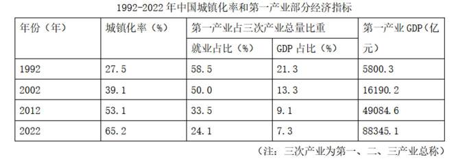 下表显示了中国城镇化与产业发展的相关数据(数据来源:《中国统计年鉴2023》)。
