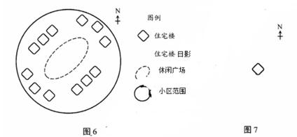 图6为我国某地一住宅小区示意图,图7中四个方向的阴影分别为小区内某栋住宅楼二至日8:00和16:00的日影。读图文材料,回答14~15题。