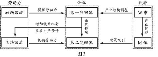 20世纪80年代,M镇的服装企业迁至省会W市进行生产经营。近年来,这些企业又陆续迁回M镇,劳动力也随之迁移流动。企业和劳动力的回流过程及原因如图3所示。读图文材料,回答6~7题。