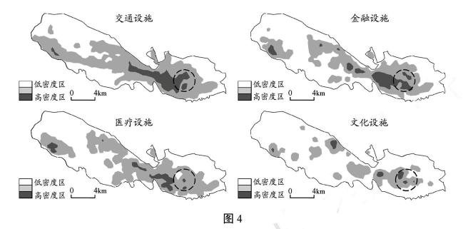 图4表示我国西北地区某城市中心城区交通、金融、医疗和文化等公共服务设施的分布密度。读图文材料,回答10~11题。
