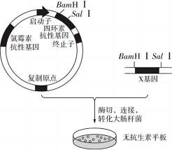 质粒中含有四环素抗性基因和氯霉素抗性基因,而四环素抗性基因中含有限制酶删除BamHI和 SalI的酶切位点,用限制酶BamHI和SalI处理质粒会破坏四环素抗性基因,而氯霉素抗性基因完整。使用限制酶BamHI和SalI处理质粒和X基因,连接后转化大肠杆菌,并涂布在无抗生素的平板上。在此基础上,若要进一步筛选含目的基因的菌株,则需要在平板中添加氯霉素,能够生长的菌落可能含有重组质粒或空质粒,再用无菌绒布轻盖在已长好菌落的原培养基上,然后不转动任何角度,“复印”至新的培养基上,即用影印法将其添加到含四环素的培养基中,在含有四环素的培养基中不能正常生长的菌落由含目的基因的菌株。