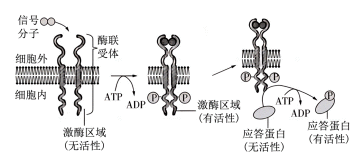 B、酶联受体可以识别信号分子,激酶区域催化ATP分解,故有识别、催化作用,但无法看出有运输作用,错误