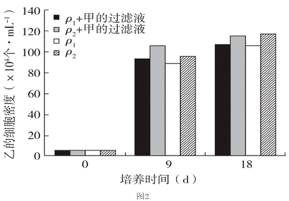 (3)根据图2结果分析可知,其他条件相同情况下,用添加乙的过滤液培养甲,一段时间后,甲的细胞密度比不添加乙的过滤液的小,说明乙代谢产生的物质明显抑制甲的生长;而用添加甲的过滤液培养乙,一段时间后,乙的细胞密度与不添加甲的过滤液的基本相同,说明乙的细胞密度变化与甲代谢产生的物质无关,结合图1结果分析知,可能是混合培养时资源、空间有限,导致乙的种群数量下降。