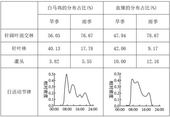 物种的生态位研究对生物多样性保护具有重要意义。研究人员对我国某自然保护区白马鸡与血雉在三种植被类型中的分布和日活动节律进行了调查,结果见下表。下列叙述错误的是( )