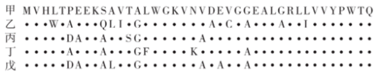 下图是甲与其他四种生物β-珠蛋白前40个氨基酸的序列比对结果,字母代表氨基酸,“.”表示该位点上的氨基酸与甲的相同,相同位点氨基酸的差异是进化过程中β-珠蛋白基因发生突变的结果。下列叙述错误的是( )