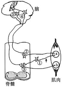 (2)大脑皮层是调节机体活动的最高级中枢,其发出的指令通过皮层下神经元④和⑤,控制位于低级中枢脊髓的神经元②和③,进而精准调控肌肉收缩,说明高级中枢可以控制低级中枢的活动,体现了神经系统对躯体运动的分级调节。图中④兴奋后可以经②将兴奋传给a(位于肌肉中),说明a可以作为反射弧中的效应器:同时a可以经①将兴奋传给③,再传给b,说明a也可以作为反射弧中的感受器根据题中信息,中枢神经元④和⑤都可以使b收缩,兴奋传导途经分别是…④→②→a→①→③→b和…⑤→③→b,因此,切断图中箭头处神经纤维,b结构收缩强度会减弱。