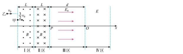 现代粒子加速器常用电磁场控制粒子团的运动及尺度。简化模型如图:Ⅰ、Ⅱ区宽度均为L,存在垂直于纸面的匀强磁场,磁感应强度等大反向;Ⅲ、Ⅳ区为电场区,Ⅳ区电场足够宽,各区边界均垂直于x轴,O为坐标原点。甲、乙为粒子团中的两个电荷量均为+q,质量均为m的粒子。如图,甲、乙平行于x轴向右运动,先后射入Ⅰ区时速度大小分别为