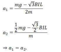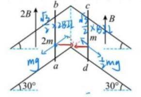 过程:由右手定则,两棒中感应电动势方向分别为a到b,c到d,A正确。E=2BLV1+BLV2,I=E/R,如图进行沿斜面方向受力分析,得两杆加速度相同即v1=v2=v,C错误。当v增大到一定程度,使得安培力与重力沿斜面方向上分力平衡,此时√3BIL=mg,故B正确;两棒产生的电动势始终不等,D错误。