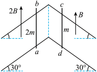 如图,两条“∧”形的光滑平行金属导轨固定在绝缘水平面上,间距为L,左、右两导轨面与水平面夹角均为30°,均处于竖直向上的匀强磁场中,磁感应强度大小分别为2B和B。将有一定阻值的导体棒ab、cd放置在导轨上,同时由静止释放,两棒在下滑过程中始终与导轨垂直并接触良好,ab、cd的质量分别为2m和m,长度均为L。导轨足够长且电阻不计,重力加速度为g,两棒在下滑过程中( )