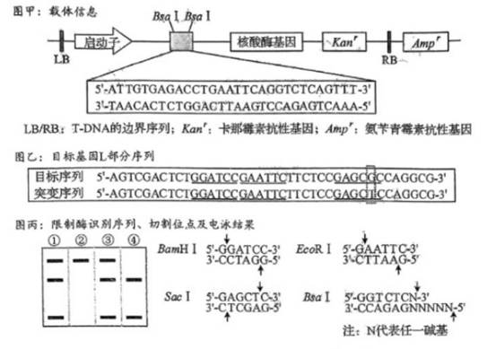 本题考查的是基因工程、PCR 技术、限制酶的作用。(1)用 PCR 技术从大豆基因组 DNA 中扩增目标基因 L 时,引物越短,非特异性结合的可能性越大,引物特异性越低。限制酶 BsaⅠ的识别序列为