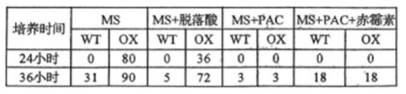 拟南芥的基因S与种子萌发有关。对野生型和基因S过表达株系的种子分别进行不同处理,处理方式及种子萌发率(%)如表所示,其中MS为基本培养基,WT为野生型,OX为基因S过表达株系,PAC为赤霉素合成抑制剂。下列说法错误的是