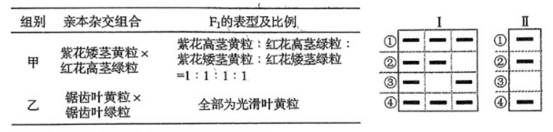 某二倍体两性花植物的花色、茎高和籽粒颜色3种性状的遗传只涉及2对等位基因,且每种性状只由1对等位基因控制,其中控制籽粒颜色的等位基因为D、d;叶边缘的光滑形和锯齿形是由2对等位基因A、a和B、b控制的1对相对性状,且只要有1对隐性纯合基因,叶边缘就表现为锯齿形。为研究上述性状的遗传特性,进行了如表所示的杂交实验。另外,拟用乙组