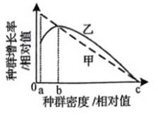 本题考查的是种群增长率与种群密度的关系、种内互助、年龄结构。乙种群存在种内互助,A 选项正确;由 a 至 c,乙种群单位时间内增加的个体数逐渐减少,B 选项错误;由 a 至 c,乙种群的数量增长曲线呈“S”形,C 选项正确;a 至 b 阶段,甲种群的年龄结构为增长型,D 选项错误。