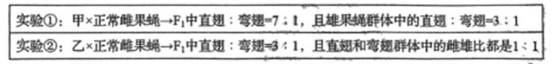 本题考查的是遗传规律、染色体变异等考点。涉及到对基因分离定律的应用、染色体结构变异对生物遗传的影响,以及通过分析杂交实验结果来推断基因与染色体的关系等内容。实验①中 F1 中直翅:弯翅=7:1,说明亲本雄果蝇(甲)产生的配子中含 A 的配子占 7/8,含 a 的配子占 1/8,由于甲的Ⅳ号常染色体发生了移接且着丝粒丢失,所以甲产生的配子可能为 A、a、AⅣ(移接且着丝粒丢失),可推出 A 配子占 7/8 时,AⅣ配子占 1/4,a 配子占 1/8,由此可推知亲本雌果蝇的基因型可能为 Aa 或 AA,A 错误。实验②中 F1 中直翅:弯翅=3:1,说明亲本雄果蝇(乙)产生的配子中含 A 的配子占 3/4,含 a 的配子占 1/4,同理可推出乙产生的配子可能为 A、a、AⅣ(移接且着丝粒丢失),可得出 AⅣ配子占 1/2,a 配子占 1/4,所以亲本雌果蝇的基因型一定为 aa,B 正确。根据上述分析,不能确定甲中含基因 A 的 1 条染色体一定移接到 X 染色体末端,C 错误。同理,不能确定乙中含基因 A 的 1 条染色体一定移接到 X 染色体末端,D 错误。