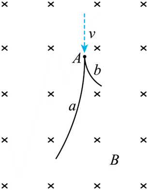 利用云室可以知道带电粒子的性质,如图所示,云室中存在磁感应强度大小为B的匀强磁场,一个质量为m、速度为v的电中性粒子在A点分裂成带等量异号电荷的粒子a和b,a、b在磁场中的径迹是两条相切的圆弧,相同时间内的径迹长度之比