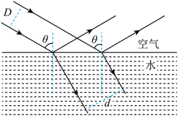 如图所示,两条距离为D的平行光线,以入射角θ从空气射入平静水面,反射光线与折射光线垂直,求: