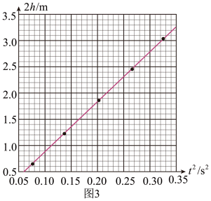 小明利用手机测量当地的重力加速度,实验场景如图1所示,他将一根木条平放在楼梯台阶边缘,小球放置在木条上,打开手机的“声学秒表”软件,用钢尺水平击打木条使其转开后,小球下落撞击地面,手机接收到钢尺的击打声开始计时,接收到小球落地的撞击声停止计时,记录下击打声与撞击声的时间间隔t,多次测量不同台阶距离地面的高度h及对应的时间间隔t。