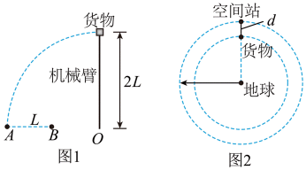 在轨空间站中物体处于完全失重状态,对空间站的影响可忽略,空间站上操控货物的机械臂可简化为两根相连的等长轻质臂杆,每根臂杆长为L,如题图1所示,机械臂一端固定在空间站上的O点,另一端抓住质量为m的货物,在机械臂的操控下,货物先绕O点做半径为