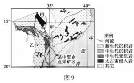(1)甲、乙、丙、丁四地中,哪一处最有可能是该采矿区成矿物质的来源地,并说明理由