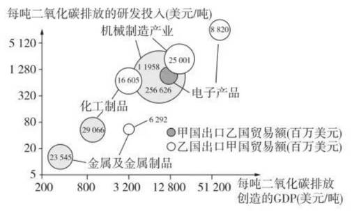 碳排放强度与社会经济发展水平、创新投入密切相关,碳中和需要付出经济代价。图2示意某年甲国和乙国重点制造业部门产品的贸易额、每吨二氧化碳排放的研发投入与经济产出情况。据比完成5~7题。