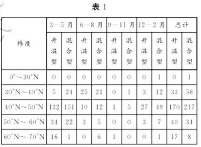 融雪洪水灾害由大量的积雪快速融化引起,可分为雨雪混合型(简称"混合型")洪水灾害和升温融雪型(简称"升温型")洪水灾害,融雪洪水中常夹杂着冰凌和融冰。表1示意1900—2020年北半球融雪洪水灾害频次。据此完成11—13题。