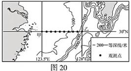 [海洋地理]图20为“我国东部部分海域等深线分布图”,图21为“沿30°N海域甲~乙的冬季表、底层海水多年平均温度和盐度空间分布图”。回答下列问题。(10分)