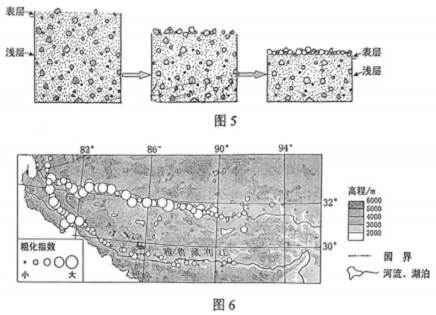 (2)分布特征:北大南小,西大东小。原因:南部和东部受到一定夏季风影响,降水较多,植被较为茂密,风力侵蚀作用较弱,风蚀粗化程度较小;北部和西部受高原内部冬季风影响较为强烈,降水较少,植被以高寒草甸草原和荒漠为主,风力侵蚀作用强烈,风蚀粗化程度较大。