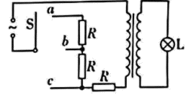如图,某小组设计了灯泡亮度可调的电路,a、b、c为固定的三个触点,理想变压器原、副线圈匝数比为k,灯泡L和三个电阻的阻值均恒为R,交变电源输出电压的有效值恒为U。开关S与不同触点相连,下列说法正确的是( )