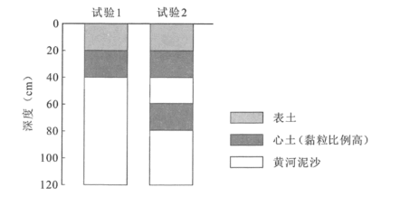 充填复垦是采煤沉陷地恢复土地生产力的常用方式,通常利用粉煤灰、煤矸石、泥沙等充填沉陷地,然后覆盖一定厚度的土壤。山东邱集煤矿地处黄河下游冲积平原,煤矿开采后,耕地大面积沉陷,并存在季节性积水,不能耕种。某研究团队利用附近引黄总干渠淤积泥沙对沉陷地进行充填复垦,为研究不同充填方式的复垦效果,开展两组试验(图),结果表明试验2粮食产量显著高于试验1。