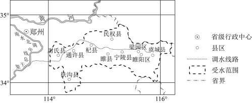 为推进南水北调后续工程高质量发展,有效缓解豫东地区水资源供需矛盾,优化供水结构,河南省规划实施南水北调豫东水资源配置工程。该工程从南水北调中线总干渠取水,采用地下管道向豫东地区10个县区供水,全线通水后受益人口超过400万人。下图示意南水北调豫东水资源配置工程。据此完成下面小题。