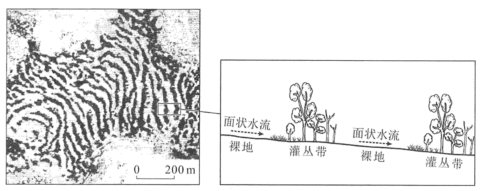 在撒哈拉沙漠南缘的萨赫勒地区,非常平缓的坡面上发育着灌丛带和裸地交替排列的带状景观。灌丛带和裸地沿等高线排列,因形似老虎花纹,又被称为虎纹灌丛。带状景观中裸地土壤渗透率低,降水多形成面状水流,并蓄积在下坡向的灌丛带中。灌丛带由草本先锋区、灌木核心区和枯木退化区三部分组成。多年监测显示,灌丛带向上坡缓慢移动。下图为萨赫勒地区虎纹灌丛遥感影像及景观示意图。