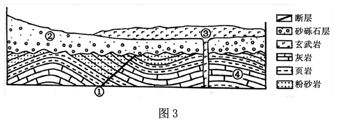 图3示意某地质剖面,其中①指断层。据此完成7~8题。