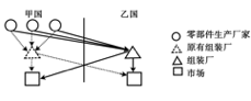 自20世纪90年代,在经济全球化浪潮下,一些国家之间签订自由贸易协定,降低甚至取消彼此间部分商品的贸易关税,促进商品的自由贸易。图1示意汽车企业在已签订自由贸易协定的甲、乙两国的产业布局调整。据此完成1—3题。