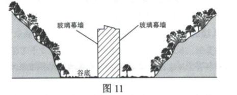 据估计,建筑物的玻璃幕墙每年导致全球数以亿计的鸟儿死亡。某度假村建于燕山南麓沟谷之中,周边树木葱茏,鸟儿啼鸣,环境优美。建筑物整体顺谷地南北向延伸,外立面大面积使用玻璃幕墙(剖面如图所示)。该建筑建成初期,清晨和傍晚鸟儿频频撞击玻璃幕墙而死亡,且清晨多发于西侧而傍晚多发于东侧。