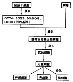 英国和日本两位科学家因发现成熟细胞可以被重新编程为多功能的“干细胞(万能细胞)”而获诺贝尔奖。下图是“万能细胞”的诞生过程(图中来自胚胎干细胞的OCT4、SOX2、NANOG和LIN28等基因决定细胞“全能性”)。请据图回答下列问题: