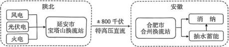 2024年,陕北—安徽±800千伏特高压直流输电工程(陕电入皖工程)和安徽岳西抽水蓄能电站开工建设。陕电入皖工程是国家构建新型电力系统、建设新型能源体系的重点工程之一,要求电力资源输送中可再生能源电量占比不低于50%。岳西抽水蓄能电站为日调节纯抽水蓄能电站。下图示意陕皖相关工程概况。据此完成1~3题。