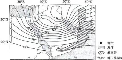 第二小题:本题考查暴雨过程中冷空气强烈下沉的影响。冷空气强烈下沉会导致迪拜雨量剧增。冷空气下沉会使空气迅速冷却,饱和水汽凝结成降水,从而引发暴雨。这一过程中,强烈的冷空气下沉是暴雨形成的关键因素,因此选D。