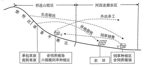 祁连山作为我国重要的生态安全屏障和水源涵养生态功能区,是河西走廊绿洲发展的重要水源地。祁连山的草原曾因过度放牧而出现生态退化现象。2011年以来,祁连山草原被划分为禁牧区和草畜平衡区(仍可放牧但不得超过核定载畜量),政府给予退出禁牧区的牧户补助、草畜平衡区的牧户奖励。经多年保护,祁连山草原生态得以恢复,促进了祁连山牧区和河西走廊农区的协同发展,牧户和农户的收益均得到提高。下图示意牧区—农区协同发展模式。