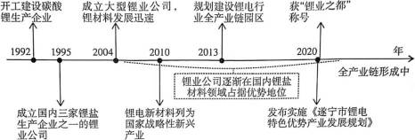 锂电产业是我国战略性新兴产业,产业上游主要是锂盐及锂材料生产,中游主要是锂电池生产,下游主要是系列终端产品生产,如手机、电脑、电动汽车等。成渝经济圈是我国重要的新能源汽车、消费电子产品生产基地。遂宁市位于成都和重庆的中间位置,经多年发展,逐渐占据国内锂盐和锂材料的优势地位,有“锂业之都”称号。下图示意遂宁市锂电产业发展时间轨迹。