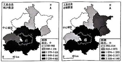 下图反映北京市2000—2020年期间各区工业企业减少数量及2020年底各区工业企业存续数量。据此完成下面小题。