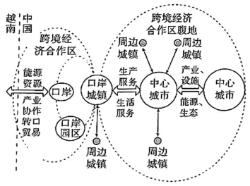 云南省河口口岸早期以货物过境贸易为主,口岸城镇功能相对单一。2007年中国河口—越南老街跨境经济合作区成立。近年来,该合作区加快推进转型升级,对口岸城镇功能及合作区腹地产生了影响。下图示意该合作区转型升级后的口岸城镇与口岸、腹地中心城市互动关系模式。据此完成下面小题。