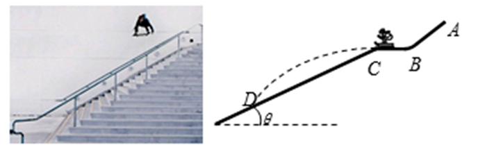如图所示,一个少年脚踩滑板沿倾斜街梯扶手从A点由静止滑下,经过一段时间后从C点沿水平方向飞出,落在倾斜街梯扶手上的D点。已知C点是一段倾斜街梯扶手的起点,倾斜的街梯扶手与水平面的夹角θ= 37°,CD间的距离s=3.0m,少年的质量m=60kg。滑板及少年均可视为质点,不计空气阻力。取sin37° = 0.60,cos37° = 0.80,重力加速度g=10 m/s2,求: