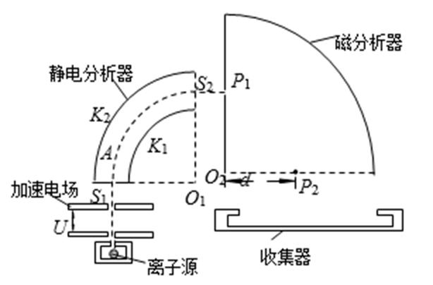 如图为某种质谱仪的结构的截面示意图,该种质谱仪由加速电场、静电分析器、磁分析器及收集器组成。其中静电分析器由两个相互绝缘且同心的四分之一圆柱面的金属电极K1和K2构成,两柱面电极的半径分别为R1和R2,O1点是圆柱面电极的圆心。S1和S2分别为静电分析器两端为带电粒子进出所留的狭缝。静电分析器中的电场的等势面在该截面图中是一系列以O1为圆心的同心圆弧,图中虚线A是到K1、K2距离相等的等势线。磁分析器中有以O2为圆心的四分之一圆弧的区域,该区域有垂直于截面的匀强磁场,磁场左边界与静电分析器的右边界平行。P1为磁分析器上为带电粒子进入所留的狭缝,O2P1的连线与O1S1的连线垂直。