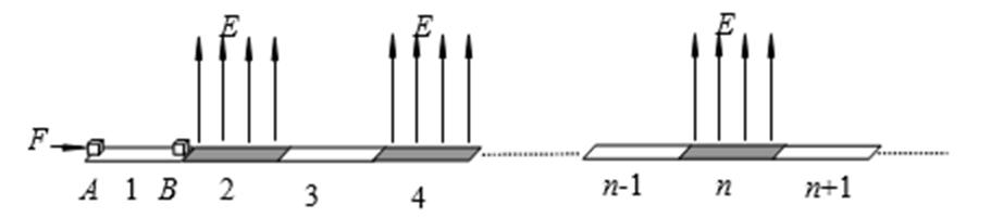 如图所示,有一固定在水平面的平直轨道,该轨道由白色轨道和黑色轨道交替排列并平滑连接而成。各段轨道的编号已在图中标出。仅黑色轨道处在竖直向上的匀强电场中,一不带电的小滑块A静止在第1段轨道的最左端,绝缘带电小滑块B静止在第1段轨道的最右端。某时刻给小滑块A施加一水平向右的恒力F,使其从静止开始沿轨道向右运动,小滑块A运动到与小滑块B碰撞前瞬间撤去小滑块A所