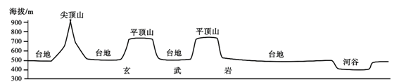 (3)说明玄武岩台地上有平顶山、尖顶山分布的原因。(6分)