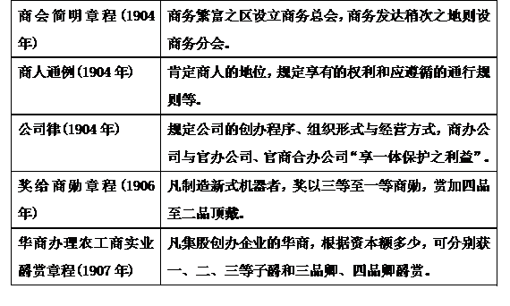 (1)广泛组织商会;制定商律,保护商人开办公司的各项权益;对商人授予商勋和爵位。