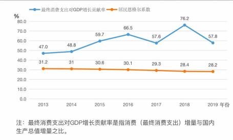 图7 2013~2019年我国最终消费支出对GDP增长贡献率和居民恩格尔系数的变化