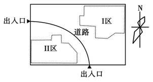 为获得冬季防风、夏季通风的效果,我国东北平原的某城市对一居住区进行了相应的建筑布局规划,规划建筑物为高层(7层以上)和多层(7层或以下)。图2示意在该居住区内规划的两个居住片区、道路、出入口及当地盛行风向。据此完成4~6题。